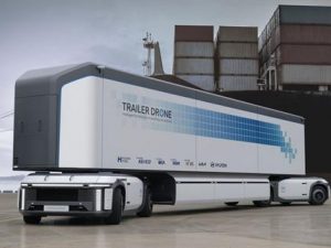 Ở lĩnh vực ô tô tải hạng nặng, xe Hyundai cũng trình làng ý tưởng Trailer Drone, hiểu nôm na là những thùng container có khả năng tự hành. Trailer Drone về cơ bản được tạo thành từ hai chiếc e-Bogies, đó là một phương tiện có hệ thống truyền động độc lập vận hành nhờ pin nhiên liệu. Chúng giống như một chiếc đầu kéo nhưng không có phần cabin phía trên với khả năng di chuyển cực kỳ linh hoạt. Hyundai còn hình dung về một tương lai với nhiều Trailer Drone kết nối với nhau để di chuyển như một đoàn tàu.